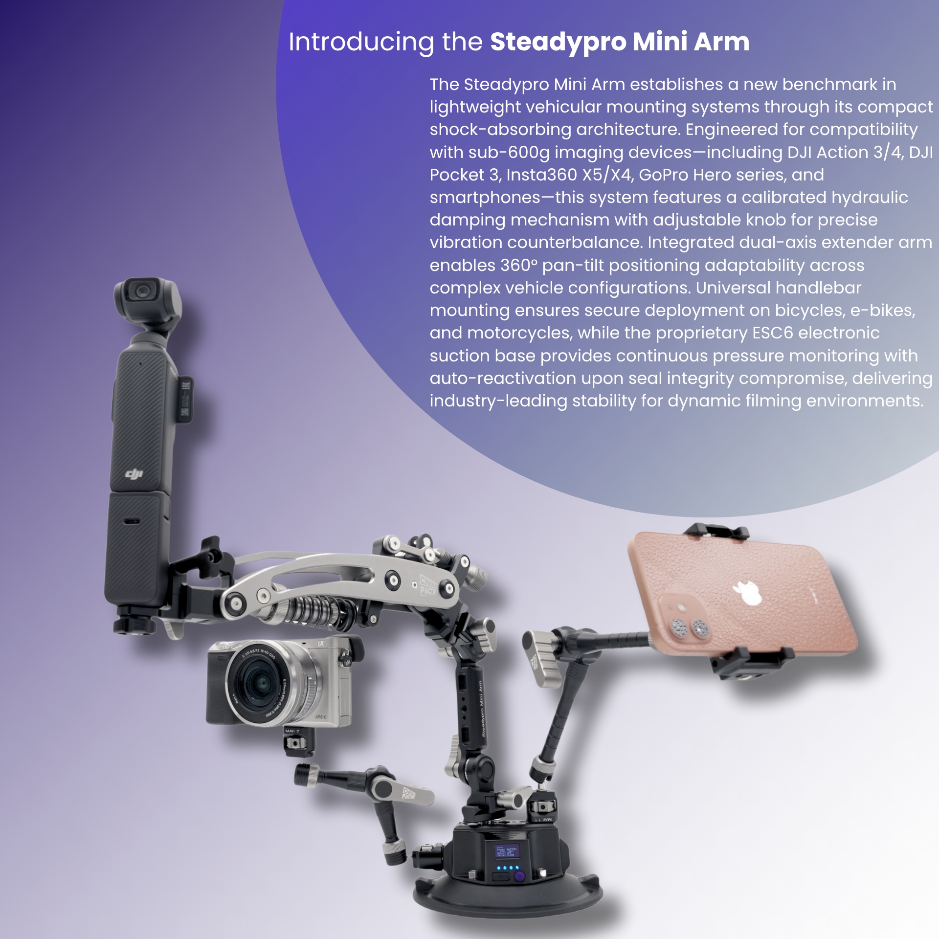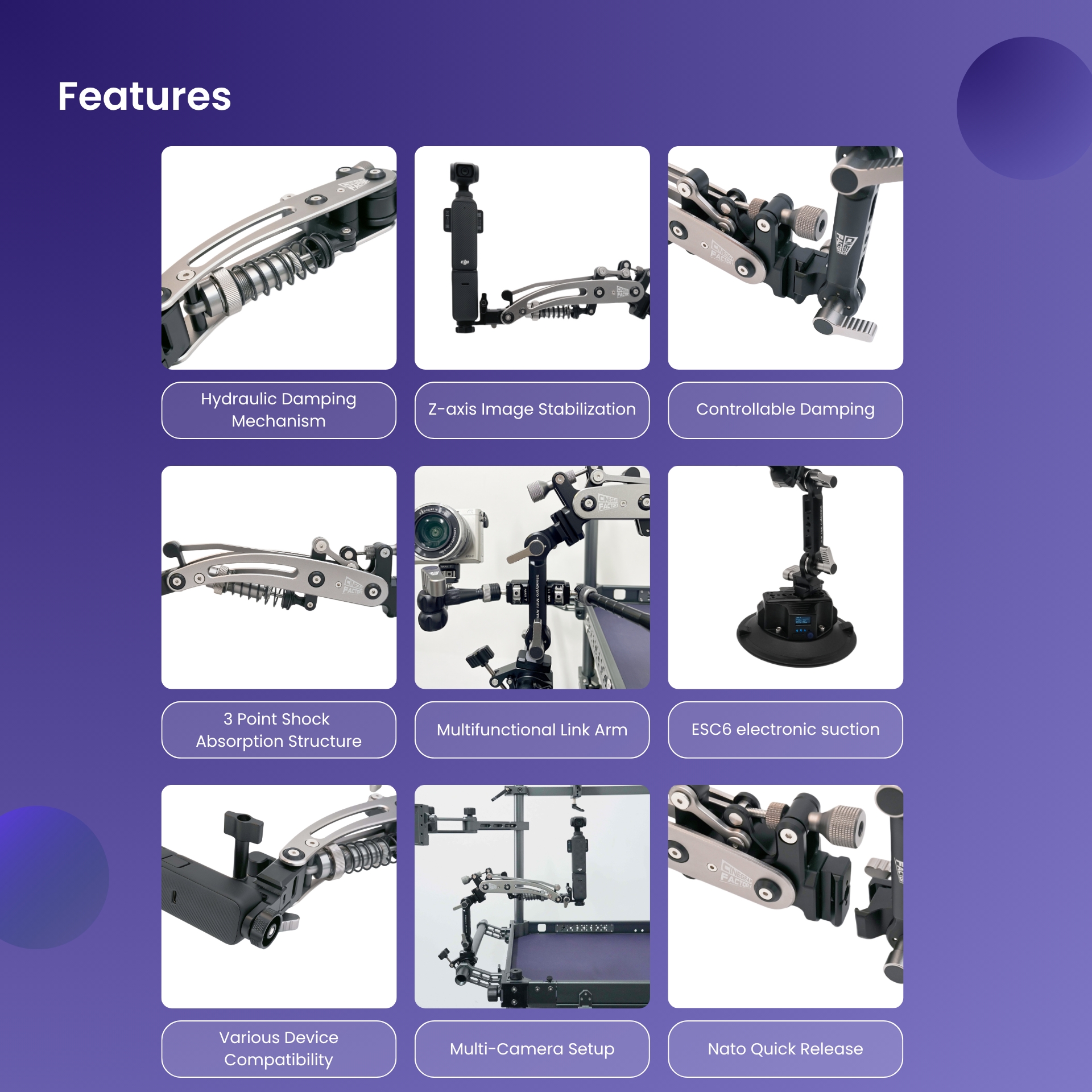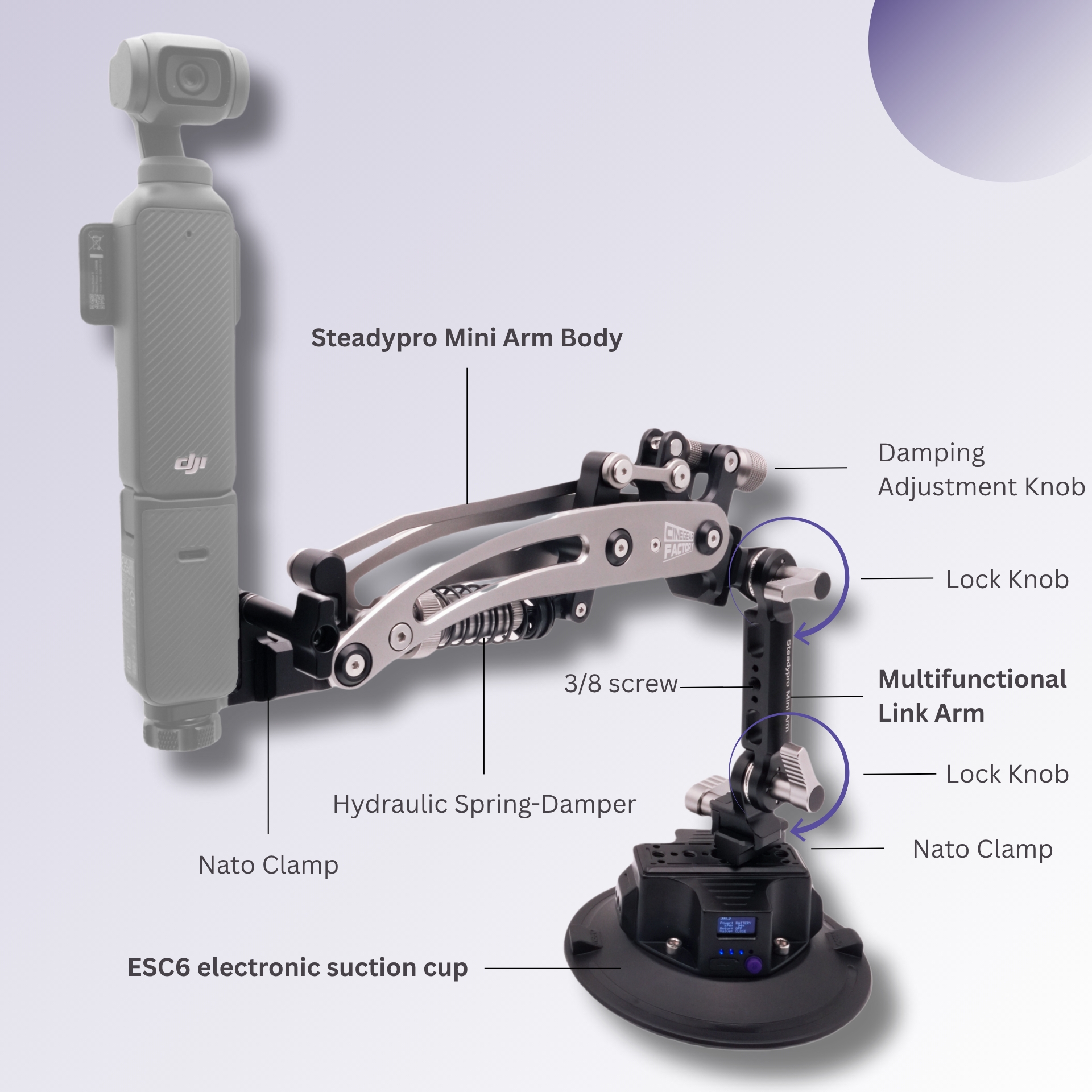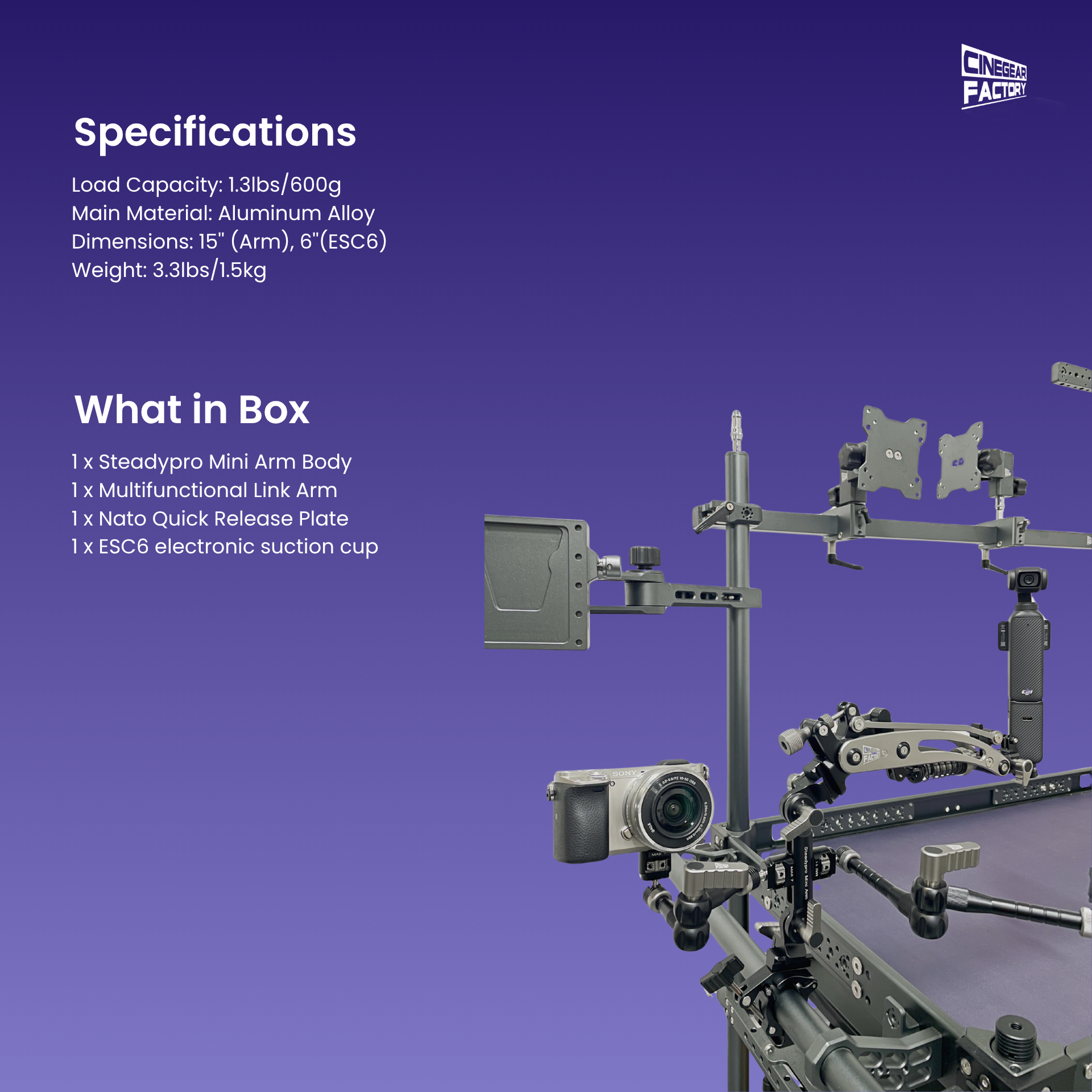 1 x Steadypro Mini Arm Body 1 x Multifunctional Link Arm 1 x Nato Quick Release Plate 1 x ESC6 electronic suction cup